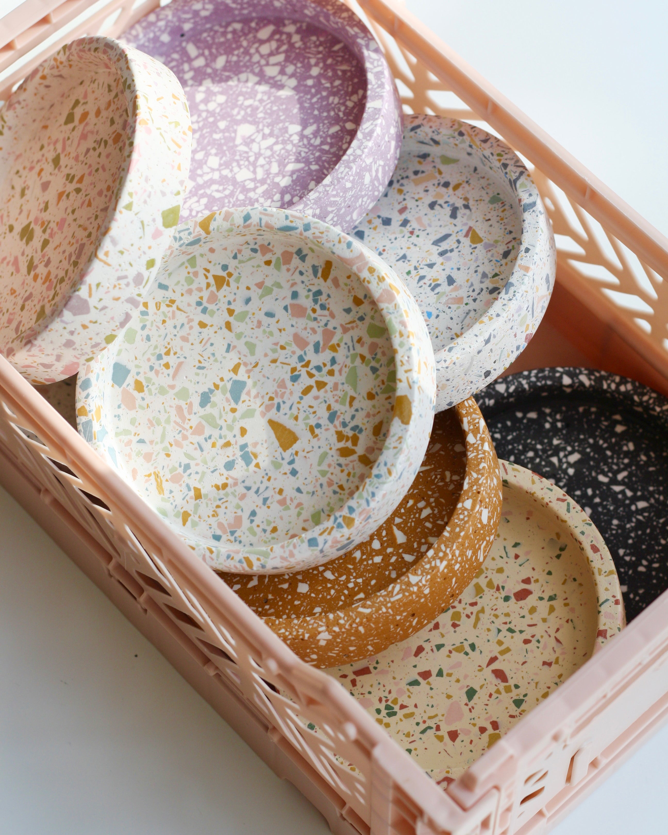 Partecipa ai nostri workshop e realizza uno svuotatasche in resina ecofriendly con la tecnica terrazzo o tinta unita con margherite